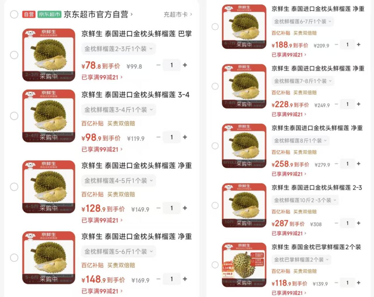 JD自营京鲜生泰国金枕榴莲预售,巴掌/大果低至78元起