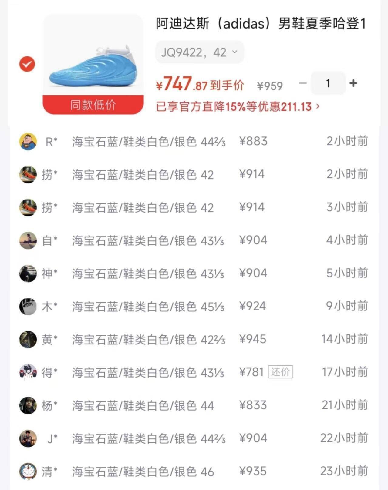 阿迪达斯哈登10号宝石蓝鞋到手价747元,得物同款904元
