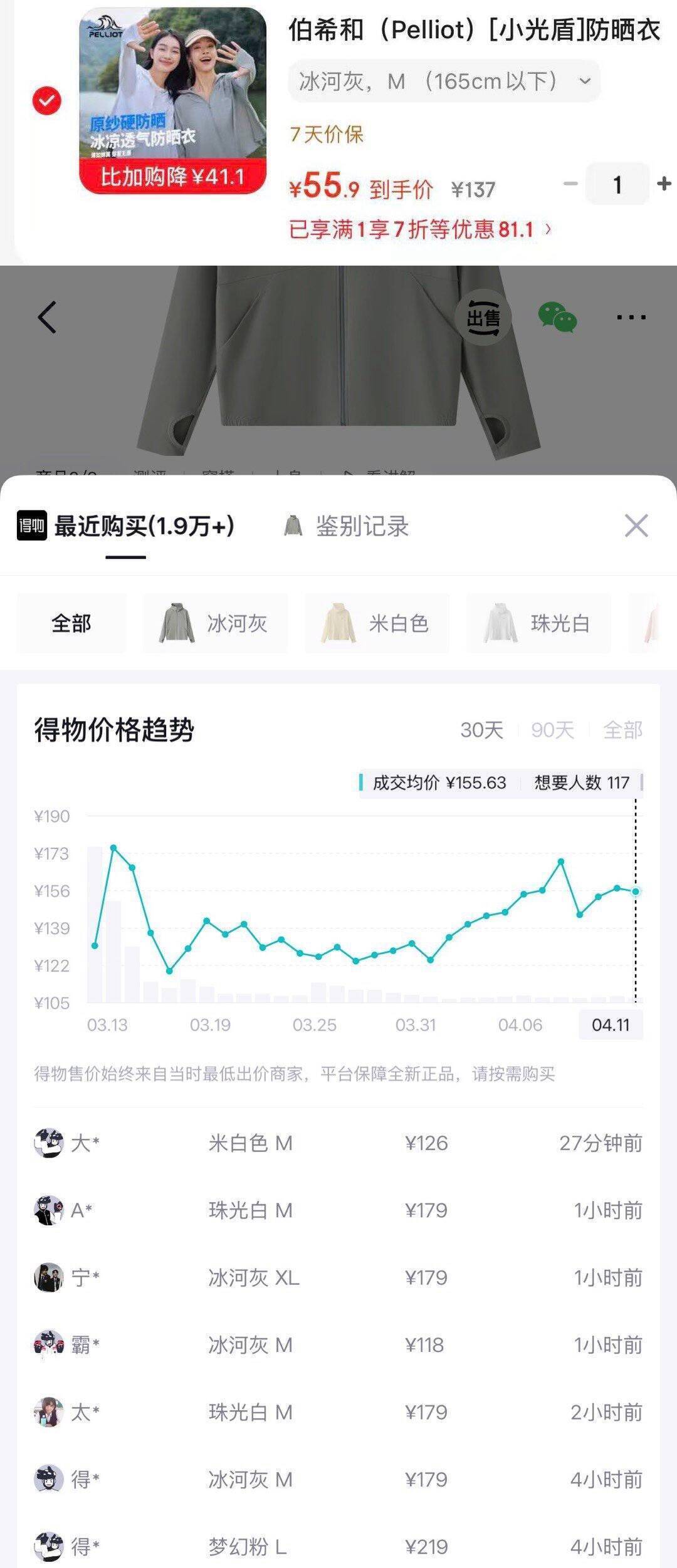 伯希和防晒衣到手价56元(得物179元)