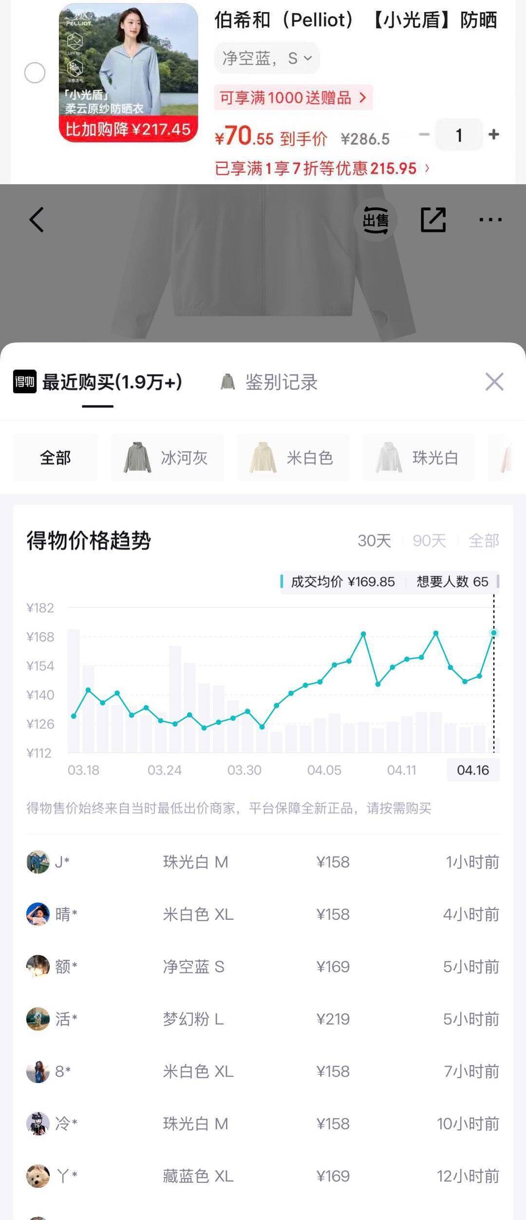 小光盾防晒衣到手价70元(得物159元)