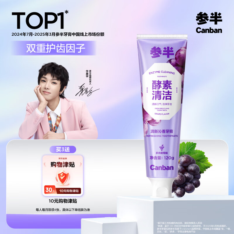 参半酵素牙膏1.6元/支!拍3付30反25卡,到手价仅5元