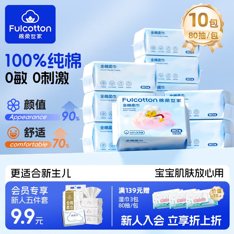 棉柔世家纯棉洗脸巾80抽*10包,叠首购到手41.9元