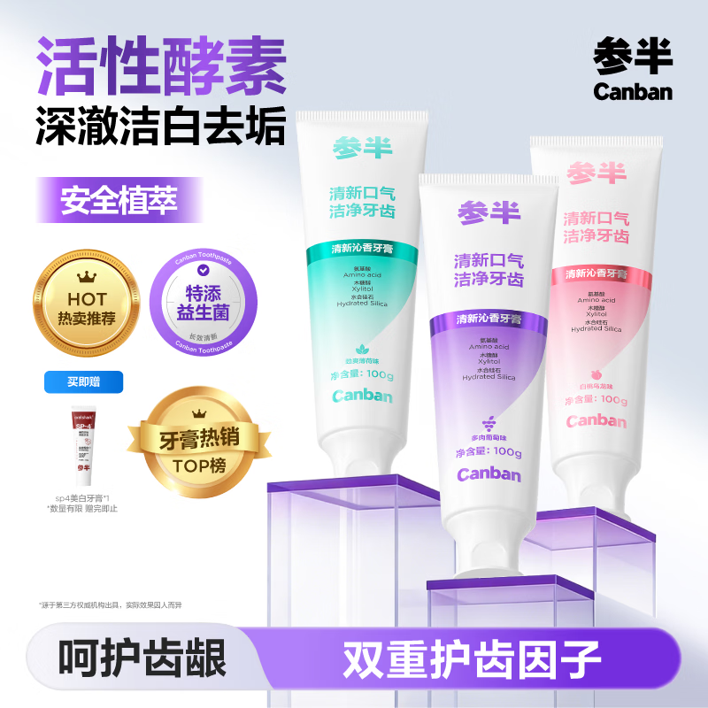 ¥19.9 参半酵素牙膏 美白去黄去牙渍牙垢清新口气 【囤货必备】酵素牙膏100g*3 29.9
