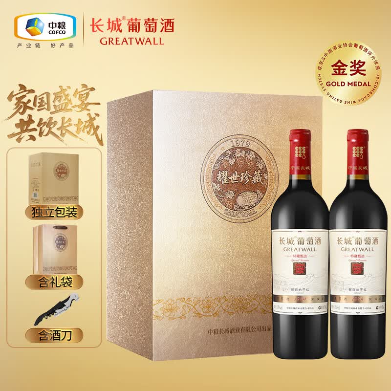 凑单必入!长城耀世珍藏解百纳干红葡萄酒750ml*2瓶双支礼盒