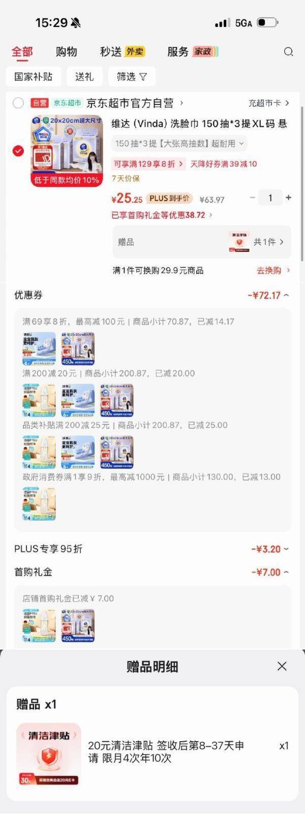 维达洗脸巾150抽*3提,首单凑单后仅5.25元