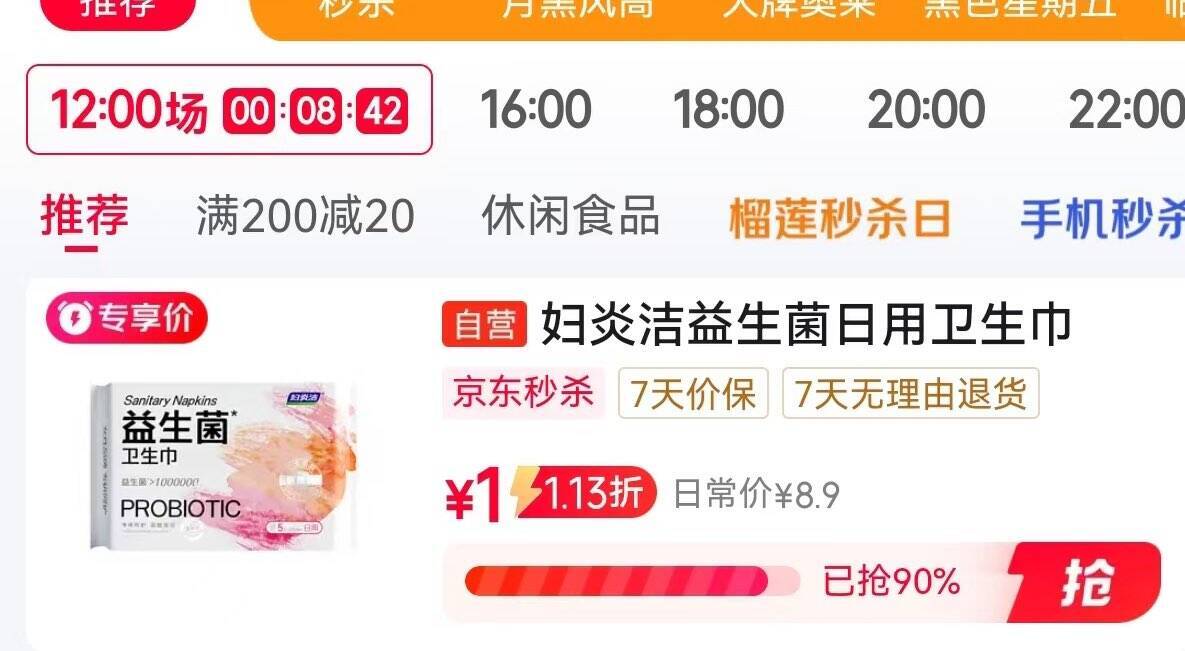 妇炎洁&千金净雅卫生巾秒杀:1元抢日用超薄款