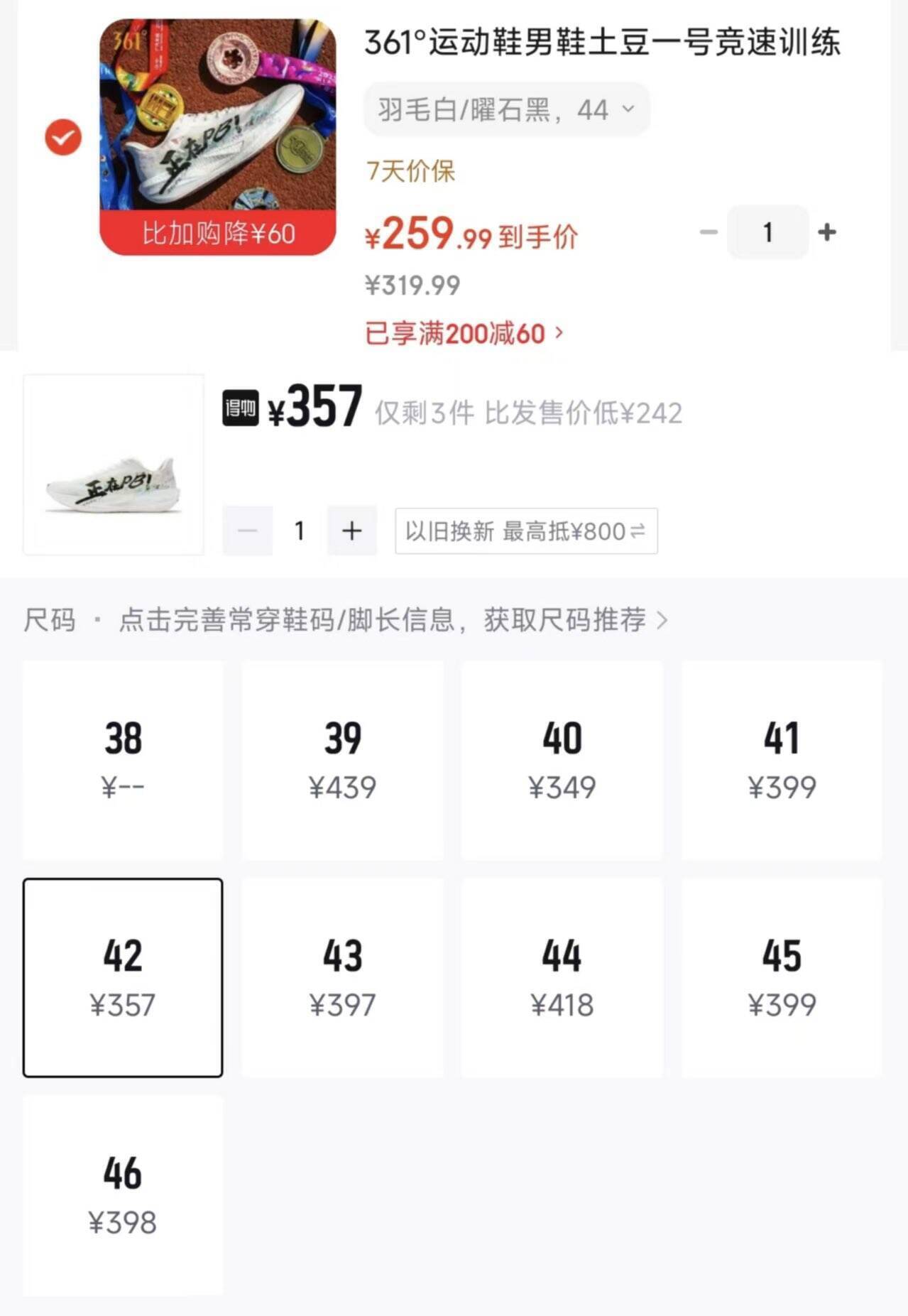 361度土豆1号运动鞋:购物金叠加到手价251元(得物售价359元)