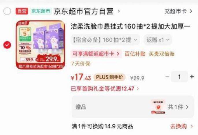 洁柔洗脸巾XL码2提到手价2.43元