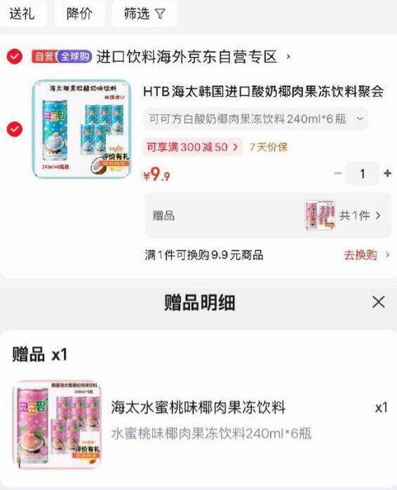 HTB海太酸奶椰肉果冻饮料240ml*6瓶 临期9.9元