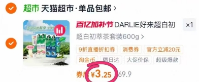 在售价69.9元,领5元券,标题下领99-10超市卷,下拉直播间弹9折加购1件,然后商品页右上角三个点点进去-底部淘金币点进去-淘金币 我的足迹页加购1件,最后凑单修改数量1件,叠凑单2款,叠淘金币+满200-25元消费券+88VIP,折牙膏4.3元返1元猫超卡,相当于3.3元到手;按步骤先🔒‼️‼️没消费卷的话貴3块多也合适