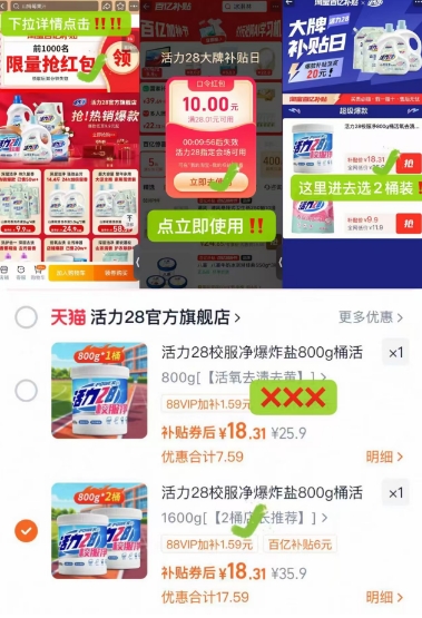 商品页价格下拉详情页-领限量10元红包-跳转页面下单(看下图),拍2桶选项,实付18.3元包邮;
