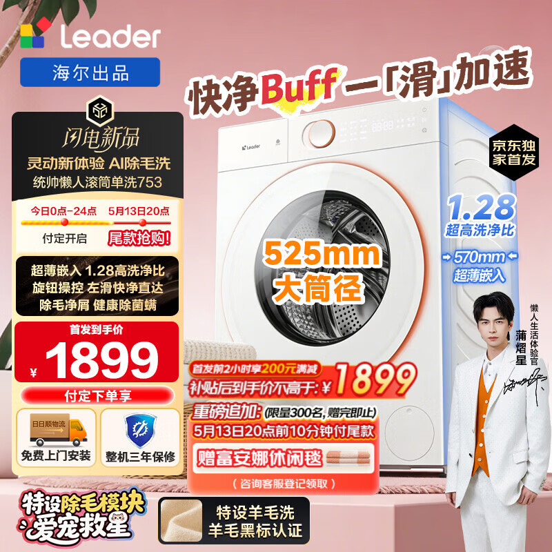 统帅海尔出品12公斤滚筒洗衣机,到手价仅需3799元