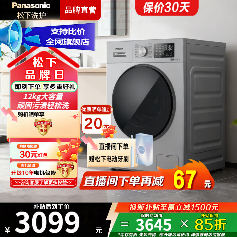 松下大海豹12KG滚筒洗衣机 到手价3645元