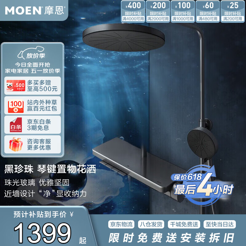 摩恩恒温花洒套装:领5折券到手仅需半价,黑珍珠枪灰质感升级
