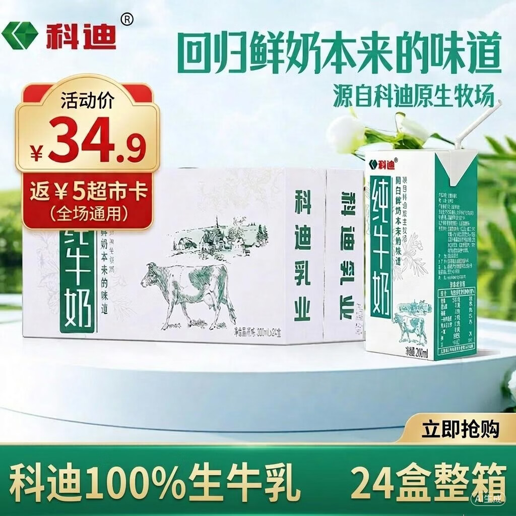 科迪纯牛奶24盒装拍下34.9元,折1.2/盒