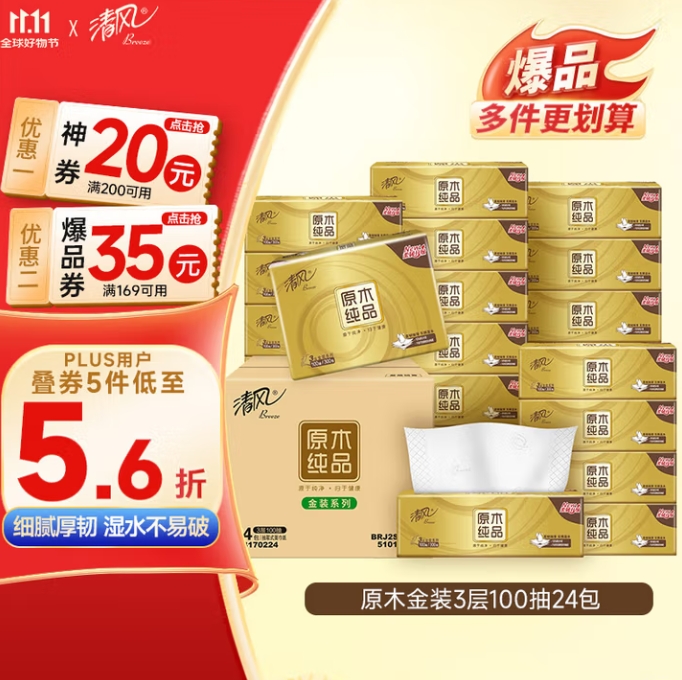 44.74元!清风 金装3层100抽24包S码*2件