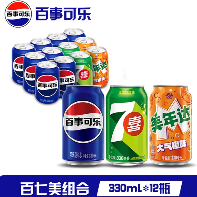 16.9元包邮!百事 可乐 碳酸饮料 经典罐百七美组合330ml*12罐
