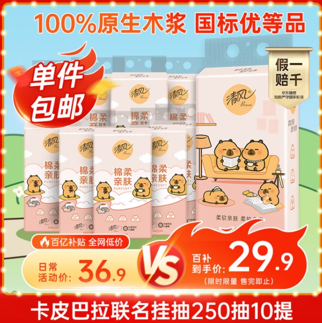 16.9元包邮!清风 挂抽 悬挂式抽纸4层加厚250抽10提(返10元购物津贴后)