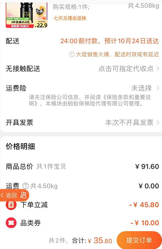 在售价45.8元,店铺下单拍2件立减45.8元,叠加10元券,拍2件实付35.8元,折单件17.9元。