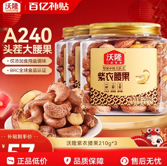 【0点】57.5元包邮!沃隆越南紫皮腰果210g*3