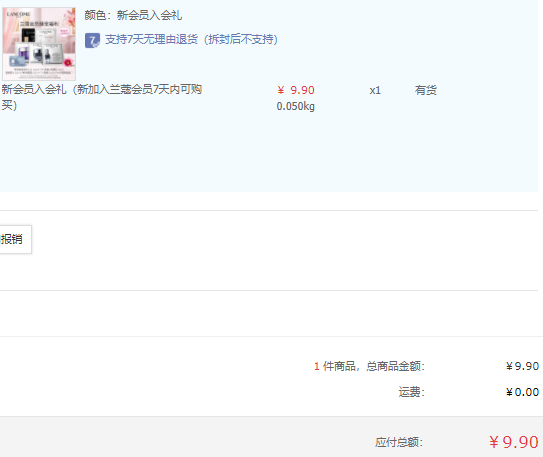 会员售价9.9元包邮,限新会员(新加入兰蔻会员7天内可购买);