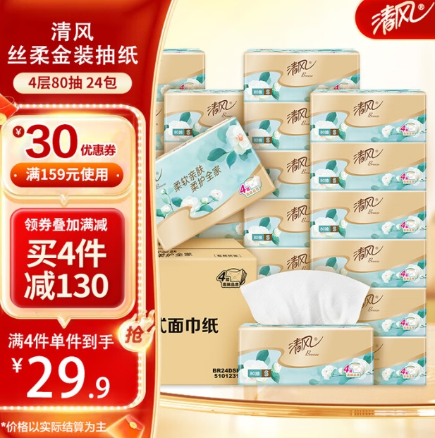 21.4元!清风抽纸丝柔厚柔金装花萃 4层 320张*24包
