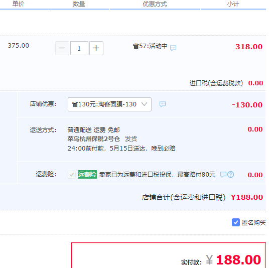 目前售价318元,叠加领取130元优惠券,下单实付188元包邮包税!加赠同款20ml,到手共120ml!