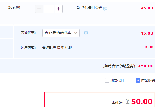 目前售价95元,领取45元优惠券,实付50元包邮。