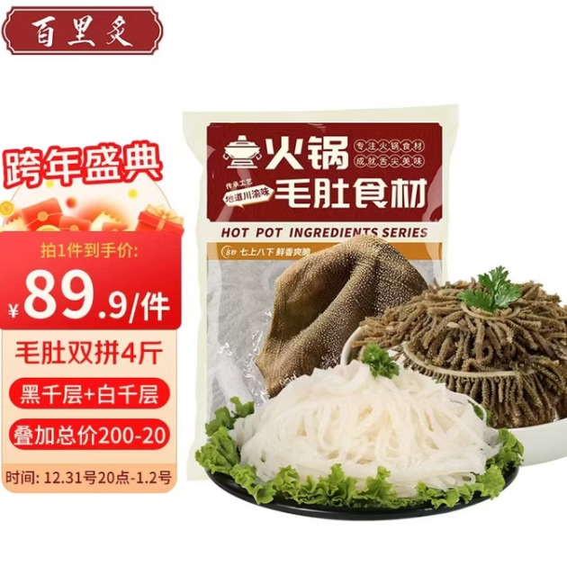 折19.9元/斤!百里炙 火锅千层毛肚4斤(黑毛肚+白毛肚)*2件