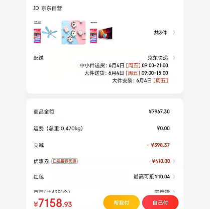目前售价7899元,APP端参加活动满3类打9.5折优惠,叠加领取400元优惠券,下单实付7158.93元包邮!