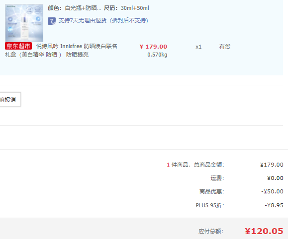 加购物车显示售价179元,领50元券,叠加Plus会员95折优惠,实付120.05元包邮;