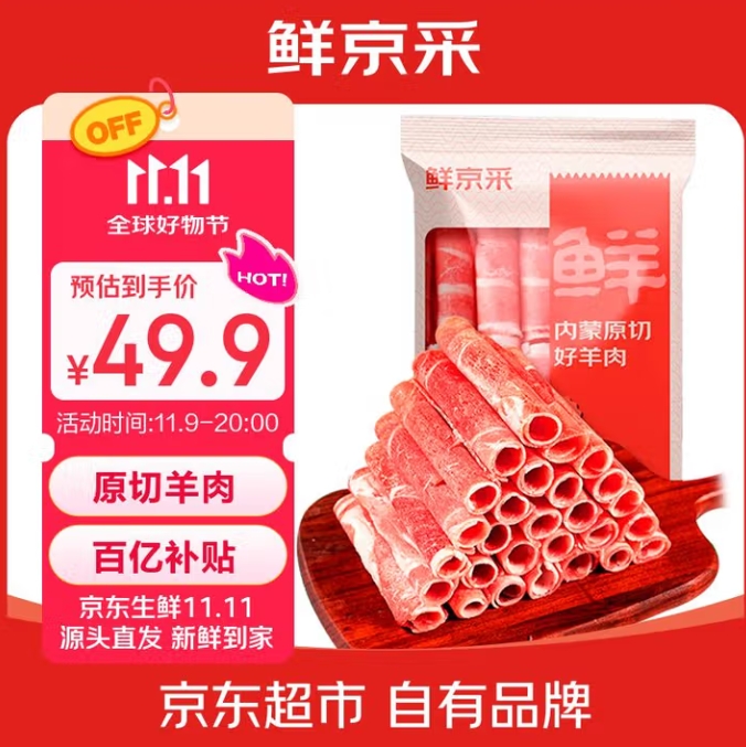 44.9元包邮!鲜京采内蒙古原切羔羊肉卷2斤(返5元E卡后)