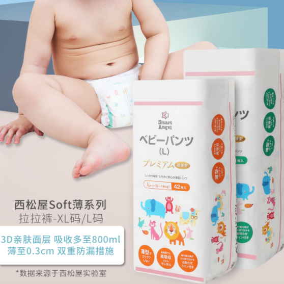西松屋原装进口拉拉裤,采用进口高分子吸收树脂,快速吸收尿液,让宝宝时刻干爽,远离红屁屁
