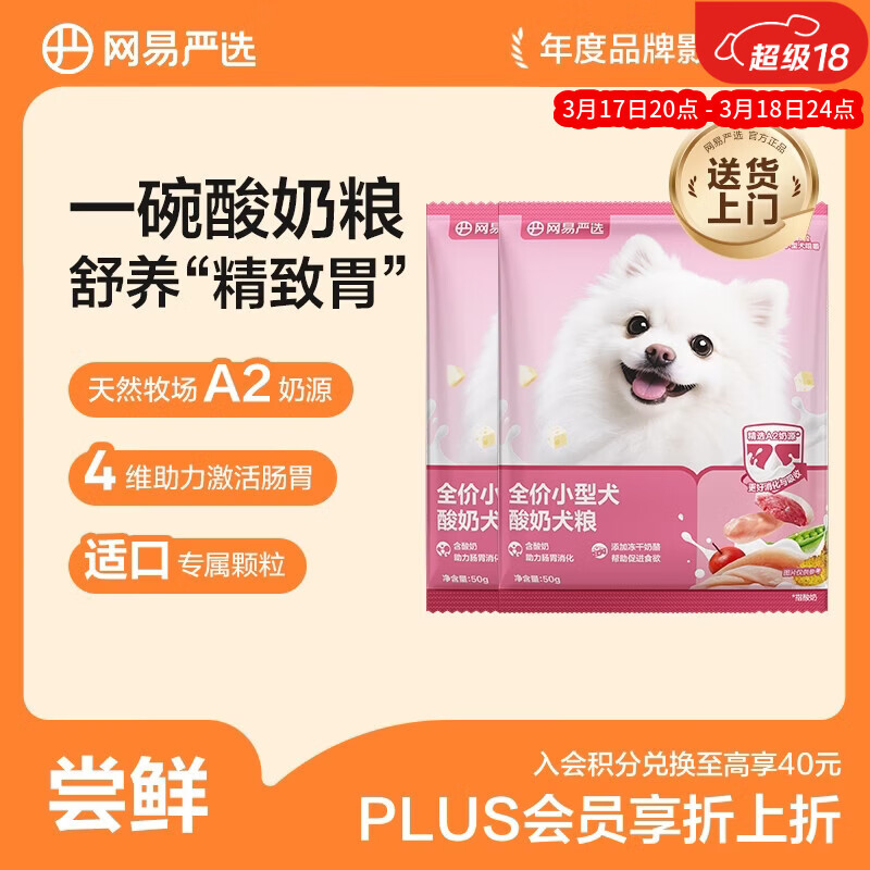 网易严选犬粮:小型犬酸奶狗粮50g*2+全价三拼鸭肉梨老鸭汤120g,组合专享价