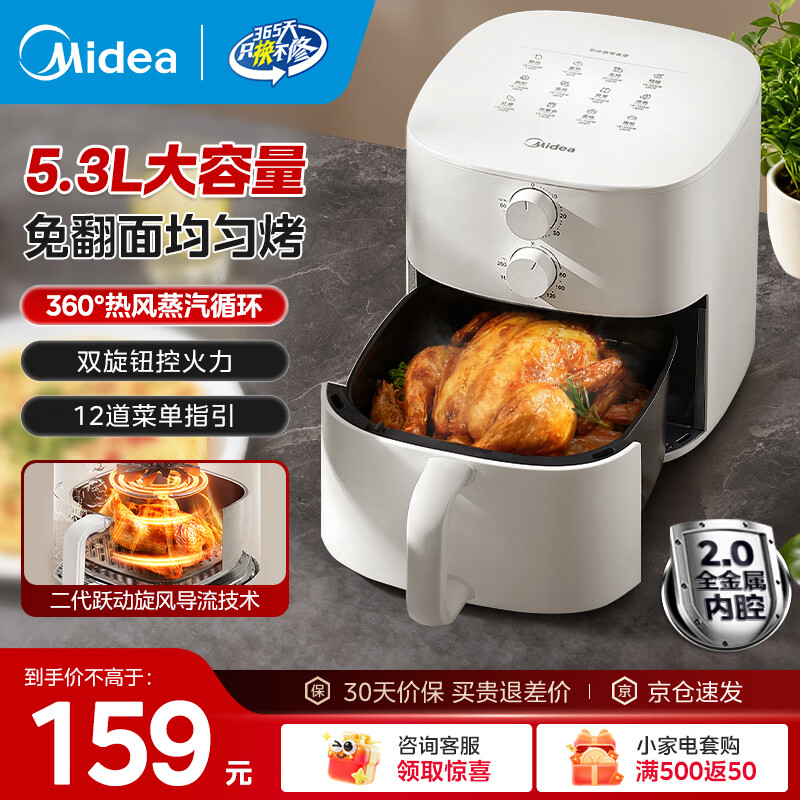 美的空气炸锅143.1元:5.3L大容量炸烤一体,微蒸汽嫩烤不用翻面
