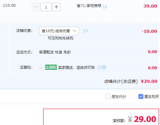 目前售价39元,领取10元优惠券,实付29元包邮。