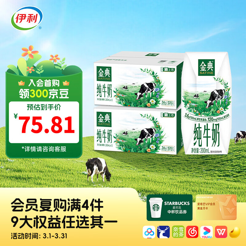 伊利纯牛奶200ml*12盒*2箱 到手价59.8元