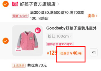 旗舰店售价¥129,可使用¥70优惠券,实付¥59包邮!还可以选择价格下方领取500-70元优惠券,凑单支付,一起下单支付后,儿童外套可以做到40.98元包邮到手!