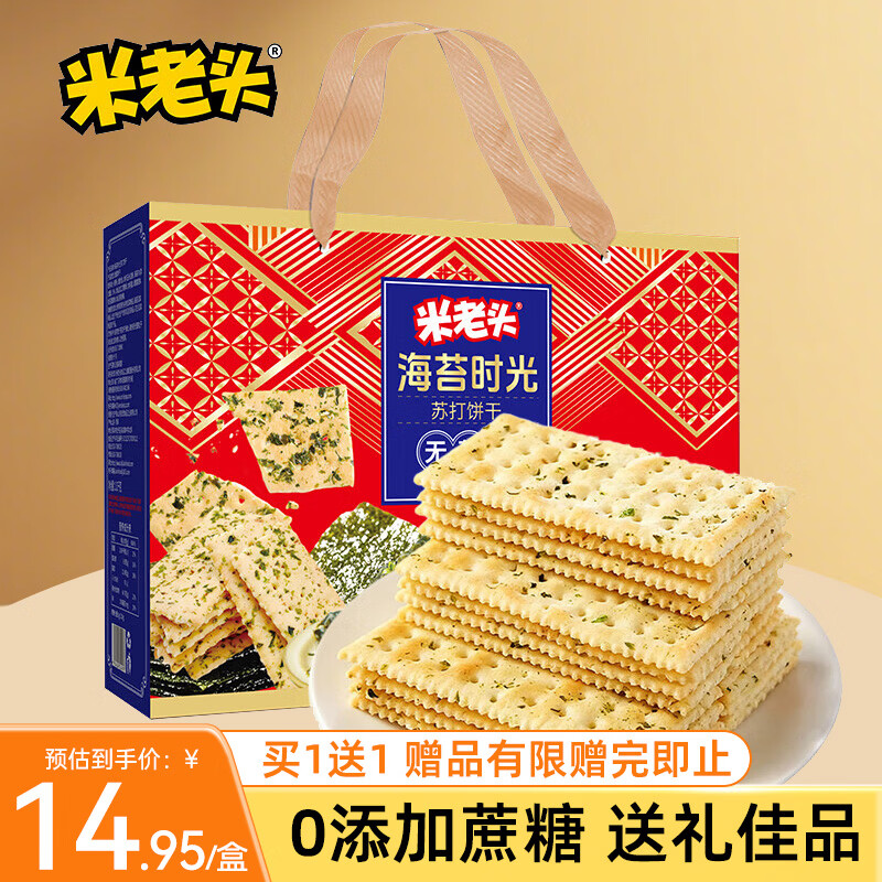 米老头无蔗糖海苔苏打饼干礼盒买一送一,到手仅 14.9 元/大盒!