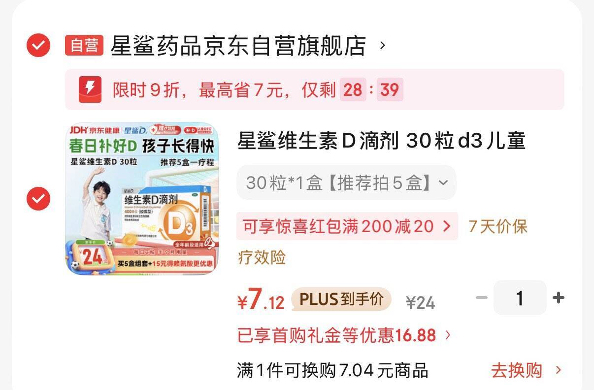 星鲨维生素 D3 儿童健康 5 折券,到手仅 7.2 元!