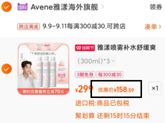 现售价299元,下单8.32折,领60元券,凑单叠加跨店满300-30优惠,最终雅漾实付158.89元到手;
