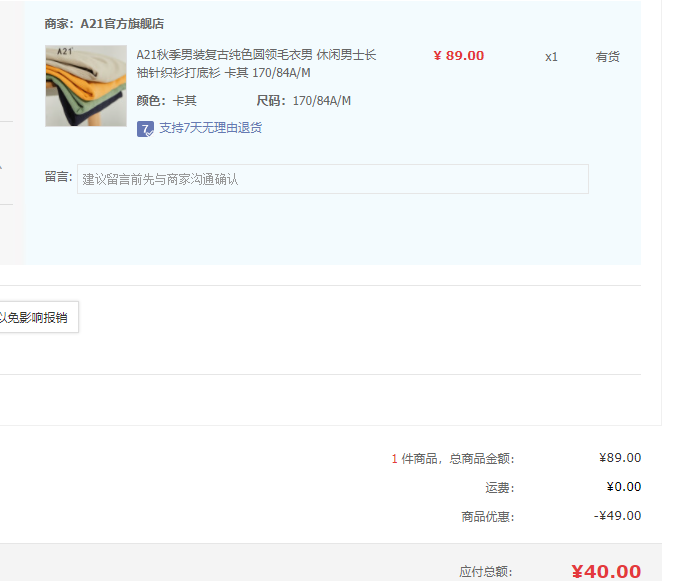 目前售价89元,领取49元优惠券,实付40元包邮。