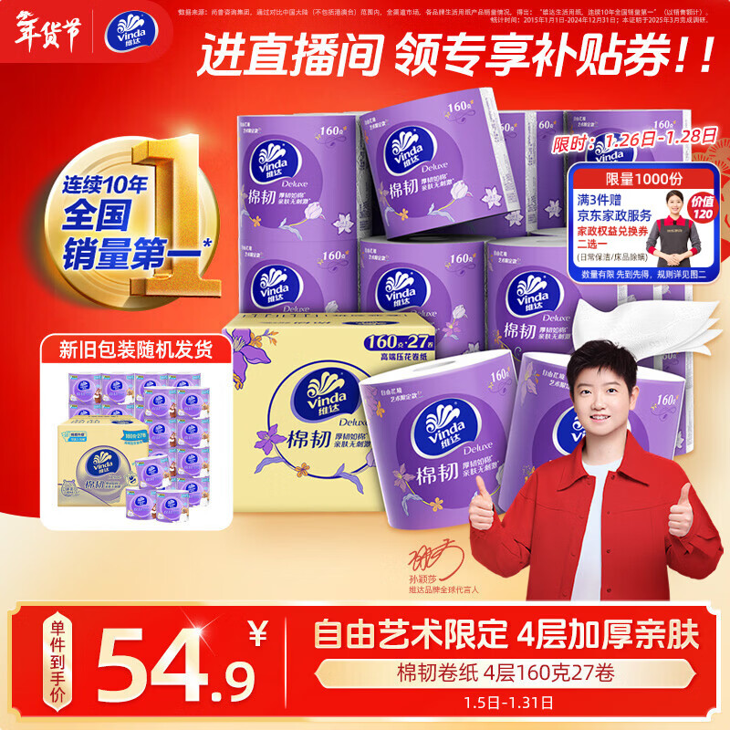 维达棉韧有芯卷纸4层160克*27卷 plus会员3件到手价116.1元