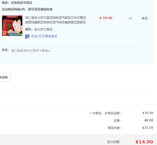 售价39.9元,领取25元优惠券,到手实付14.9元;