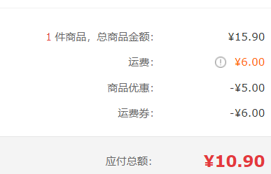 在售价15.9元,用10-5券(加入陪伴计划即可领,每天0点更新),优惠后10.9,运费券带回家