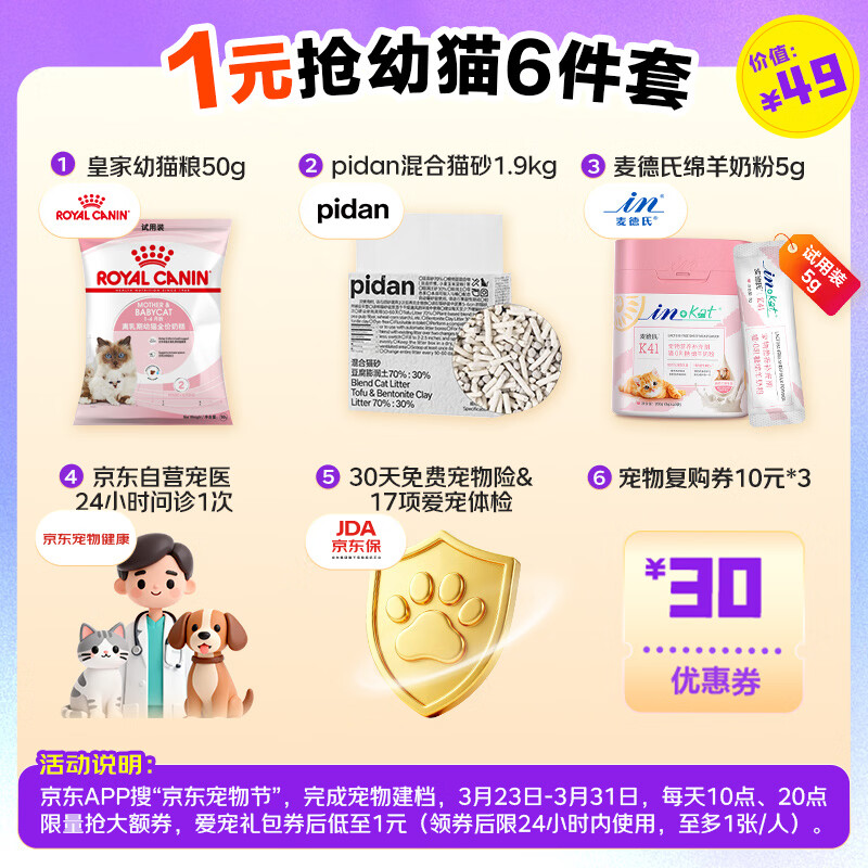 皇家幼猫礼包:领48元券后1元抢猫砂