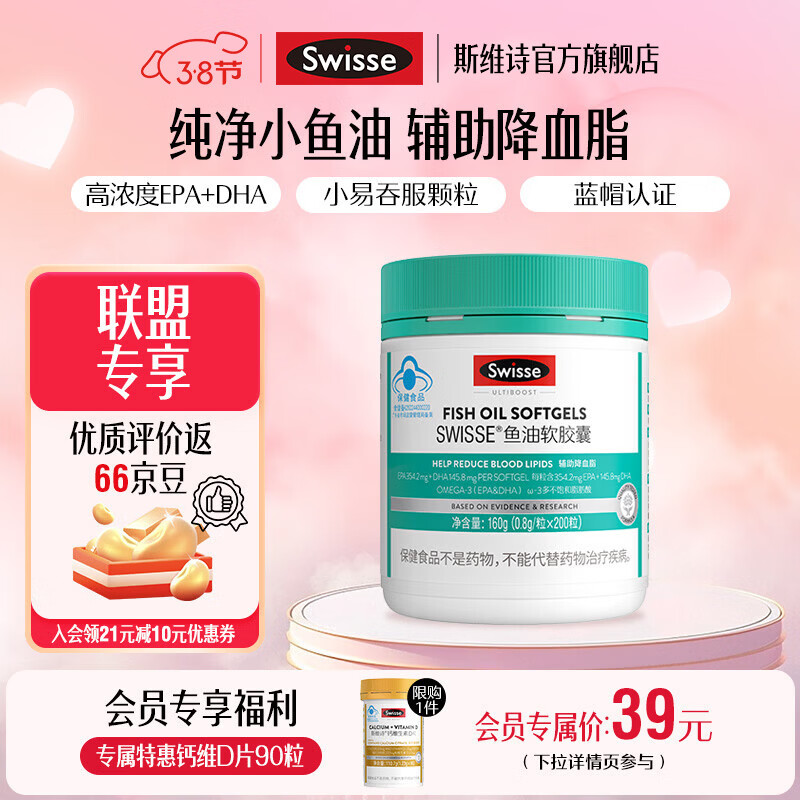 135 元抢 Swisse 斯维诗鱼油软胶囊 200 粒,蓝帽认证辅助降血脂!