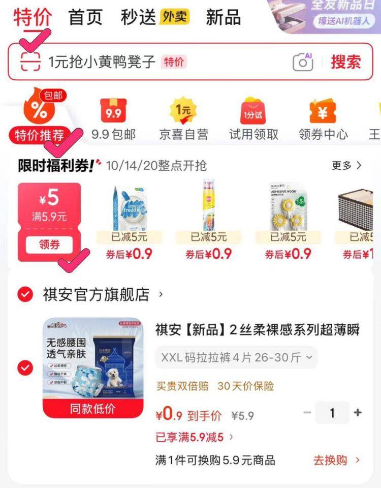 祺安纸尿裤低至0.9元!领5.9-5元券抢