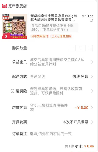 在售价13元,聚划算减5元,250克下单付8元包邮,(下单送零食)。