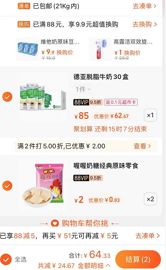 在售价85元,领10元券和凑单,叠加88-5券 一起付64元包邮,折2元一盒。